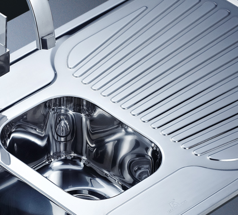 阿發水槽立邊采用國際先進的10-25°小R角一次成型拉伸技術,更具立體感與時尚潮流,亦能充分擴展水槽利用空間;一次成型拉伸技術,杜絕了焊接工藝易產生的水槽生銹,脫焊事故,充分保障水槽50年以上的使用壽命