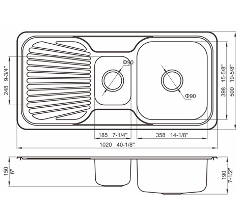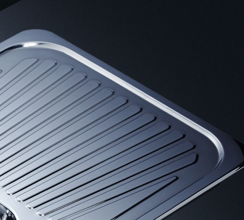 槽底采用斜面壓痕,四輻導流槽設計,與平面壓痕和無痕水槽相比,導水更為流暢,下水更迅速,能有效防止積水,消除沉淀物