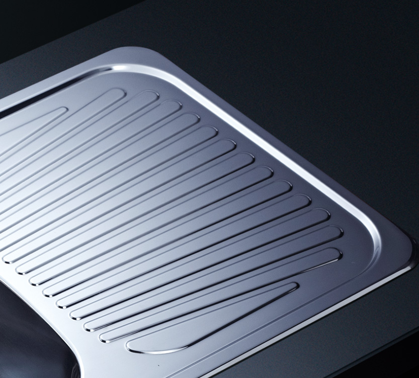 槽底采用斜面壓痕,四輻導流槽設計,與平面壓痕和無痕水槽相比,導水更為流暢,下水更迅速,能有效防止積水,消除沉淀物