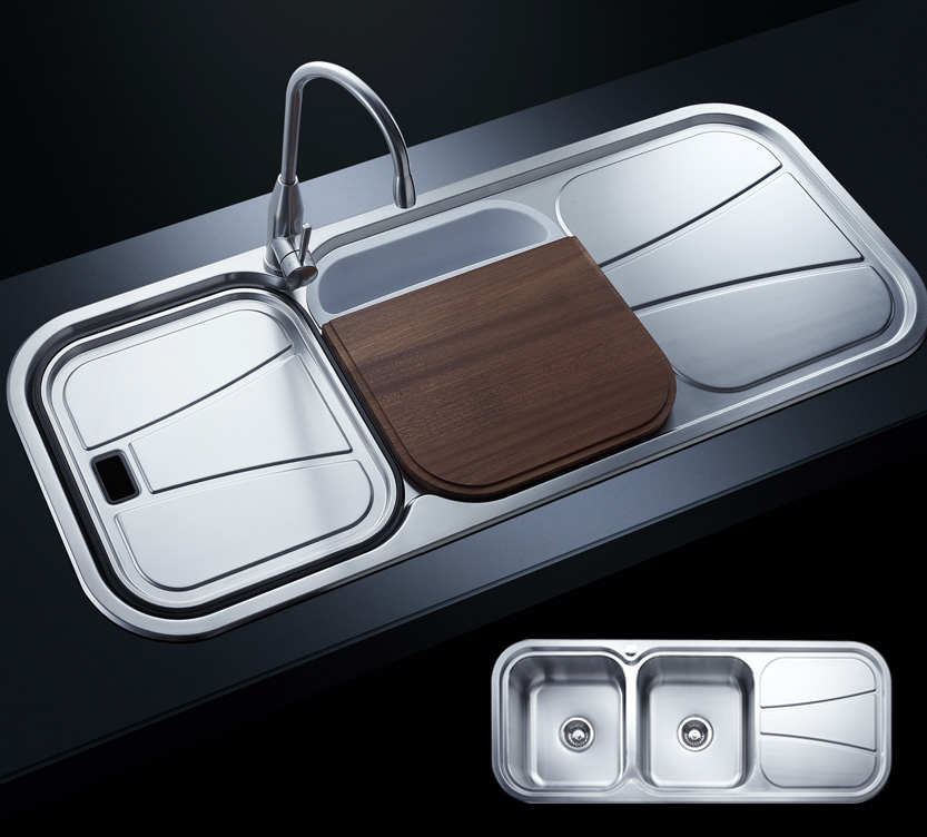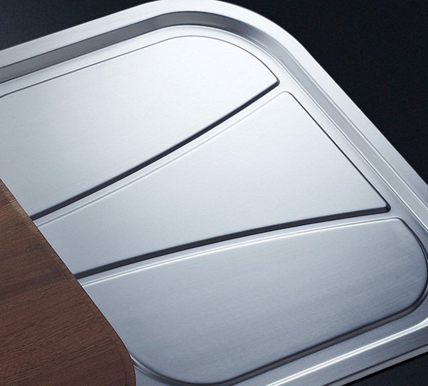 槽底采用斜面壓痕,四輻導流槽設計,與平面壓痕和無痕水槽相比,導水更為流暢,下水更迅速,能有效防止積水,消除沉淀物