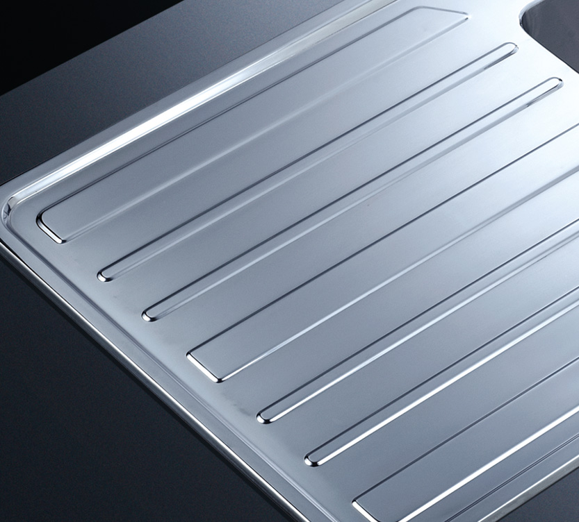 槽底采用斜面壓痕,四輻導流槽設計,與平面壓痕和無痕水槽相比,導水更為流暢,下水更迅速,能有效防止積水,消除沉淀物