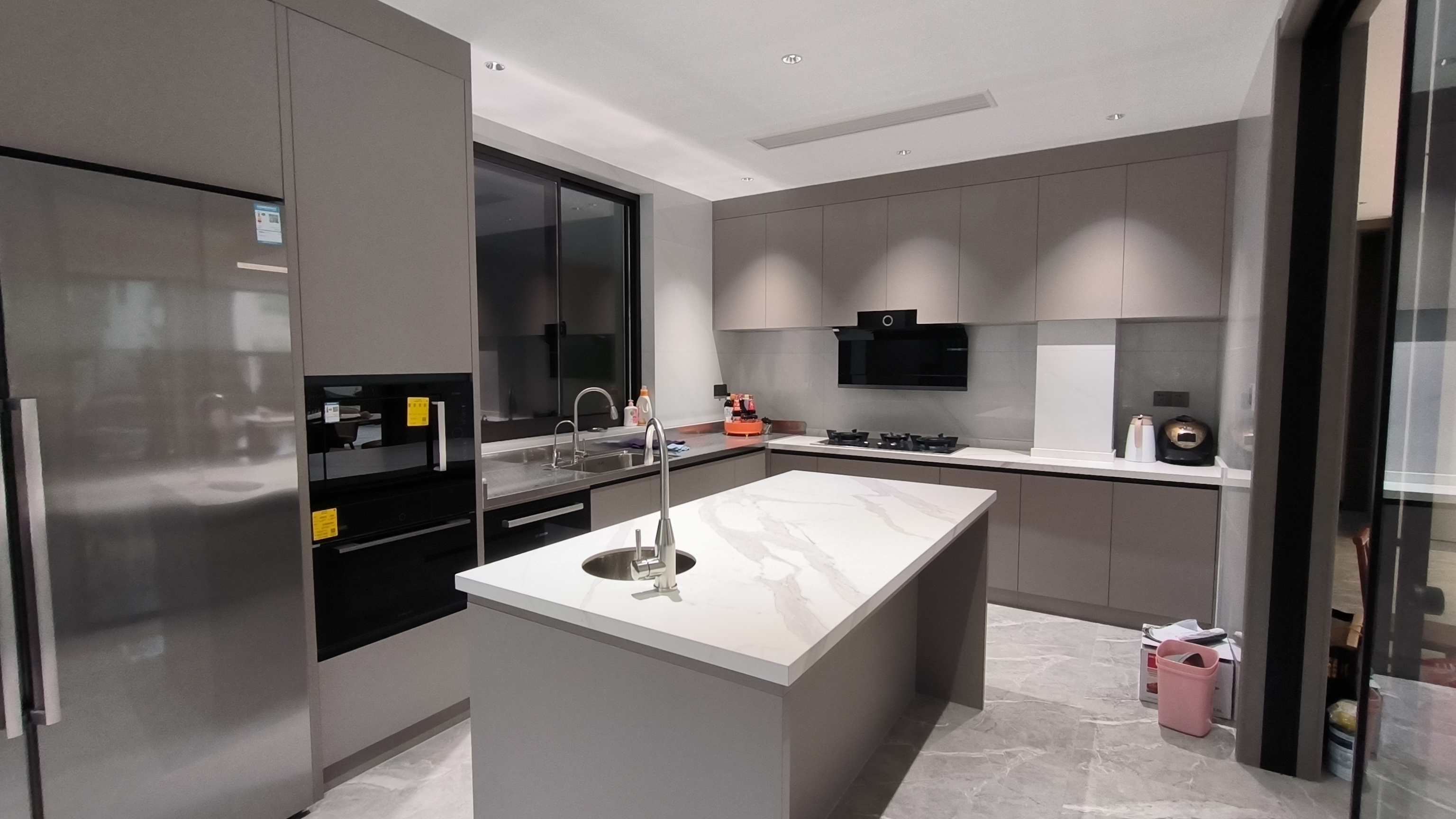 ? ? ? ? 一進廚房,你可能會納悶,廚房的大件電器都去哪兒了?我們將冰箱、蒸烤一體機、洗碗機等電器都與不銹鋼高柜巧妙融合設計,讓整個廚房看起來和諧統一,盡顯高級美感。