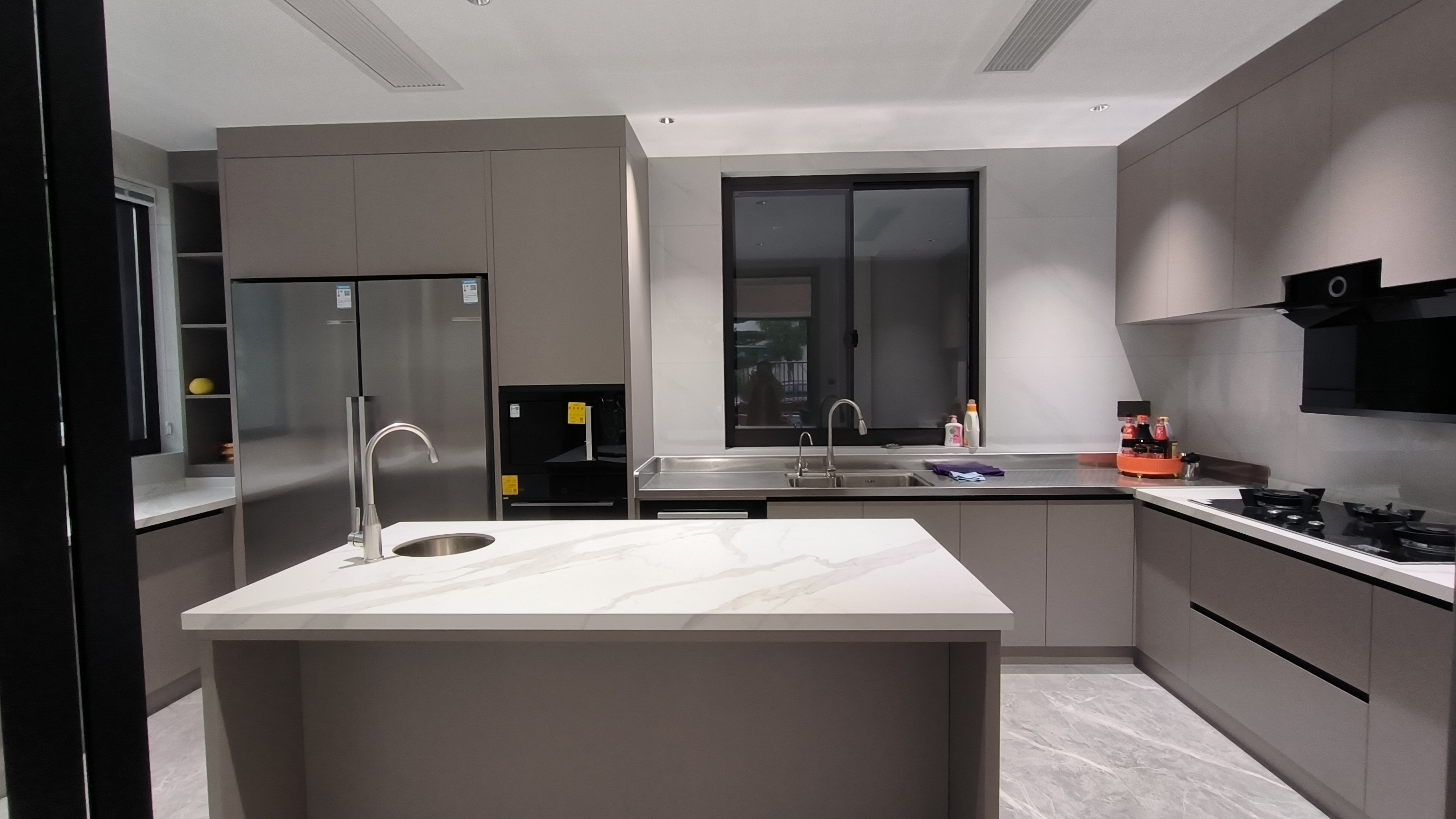 ? ? ? ? 所有的廚柜柜體和洗滌區臺面,都是采用304不銹鋼材質,卻又不失時尚感與設計感。不銹鋼臺面表面采用高強度犀牛紋壓紋工藝,耐刮劃防指紋,門板表面經220℃高溫環保烘烤工藝處理,防水抗劃,日常清潔打理超輕松。
